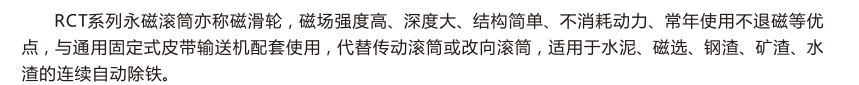 RCT series permanent magnet rollers are also known as magnetic pulleys. They have the advantages of high magnetic field strength, large depth, simple structure, no power consumption, and no demagnetization in long-term use. It is used with general fixed belt conveyors instead of driving rollers or redirecting rollers For continuous automatic iron removal of cement, magnetic separation, steel slag, slag, and water slag.